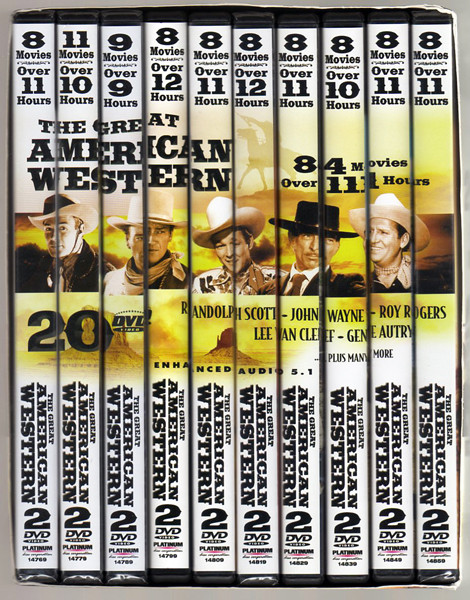 Notes: 10 part set. 2 DVDs in each part, 20 DVDs total. 5 of the 10 sets are still in factory shrink wrap. Other 5 are opened and in like new condition. Outer box is in like new condition. 84 movies, over 111 hours of entertainment. Features films by Roy Rogers, Gene Autry, Randolph Scott, Lee Van Cleef, and John Wayne. Great buy.